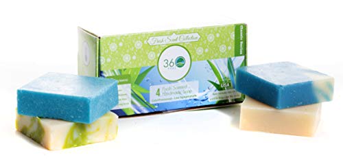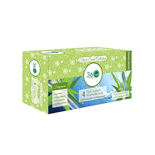 Nature Fresh Soap – Natural Organic Soaps – Homemade soap – Handmade Soap – Castile Soap- Christmas Stocking Stuffers- Valentine Gift – Easter Gift – Memorial day – Fathers Day Gift HANDMADE NATURAL SOAP (CLASSIC SERIES)- COLD PROCESS – LOW TEMPERATURE – ESSENTIAL OIL Each handcrafted soaps are made with care and love using the finest ingredients available. We use proprietary Cold Process method with low temperature preparation to preserve the essential oils and other ingredient efficacy. 360Feel – The Premium Amazon Exclusive BrandPamper yourself all around (360 degree) with Natural Goodness of the Earth. Indulge in our one-of-a-kind handcrafted collections Each handcrafted soaps are made with care and love using the finest ingredients available. We use proprietary Cold Process method with low temperature preparation to preserve the essential oils and other ingredient efficacy. >> 4 Fresh Scent Refreshing Luxury Handmade Soap Bar. Includes a collection of Fragrances: Aloe Vera, Cotton Blossom, Spring Scrub, Cool Water. Perfect for Sports, Camping, Romantic, Anniversary, Wedding Gifts >> Made with pure Essential Oils and Natural Exfoliants. Perfect exfoliating Body bar. Biodegradable perfect as Camping soap too! >> Plant Oil – Essential Oil based traditional Lye Soap. NO SLS (Sodium Laureth Sulfate) – NO Palm Oil – NO Phthalate – NO Paraben >> Vegan – Gluten Free – Cruelty Free. Acne treatment, Therapeutic Relaxing recipe body wash for Great Gift Idea, Gift basket for kids, Gifts for women >> Handmade soap Proudly Made in USA – Made with fresh Premium Natural Ingredients – lush natural glycerin castile Soap for normal to dry skin >> Cold Processed, low temperature formulation for maximum Essential oil efficacy. Standardized Base Formulation perfect for sensitive skin >> Exclusively available at Amazon. Family Owned & Operated in USA 360Feel – The Premium Amazon Exclusive BrandPamper yourself all around (360 degrees) with Natural Goodness from the wonders of the Earth. Indulge in our one-of-a-kind handcrafted products made with care and love using the finest ingredients available. Supporting and promoting craftsmen and their work doing things the good old fashioned way!!