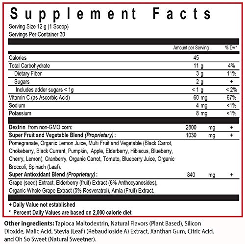 THE PUREST SOURCE: In each scoop, you will receive: pomegranate, lemon, cranberry, chokeberry, pumpkin, blueberry, elderberry, cherry, black currents, hibiscus, apple, carrot, tomato, spinach and broccoli all in one scoop.