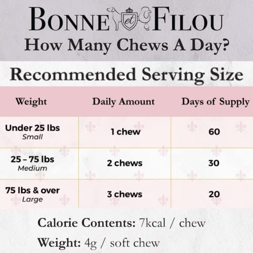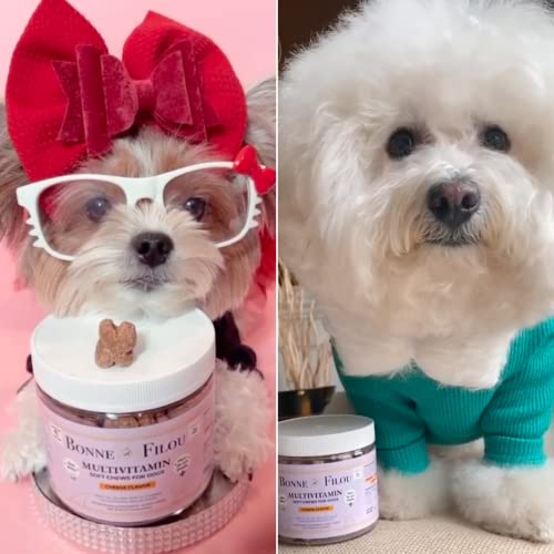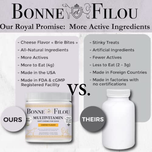 DAILY ALL-IN-ONE MULTIVITAMIN FOR DOGS: Bonne et Filou soft chew pet vitamins are a functional supplement and provide a nutritional foundation of 12 essential vitamins, living Probiotics, Glucosamine, and Actigen️. We use active premium ingredients that support everyday health, hip & joint function, and digestive aid for all breeds, sizes, and ages.
