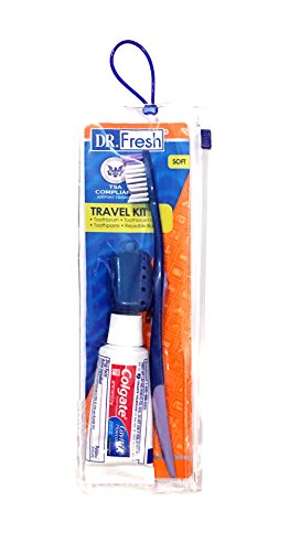 Easy pack-n-go Toothbrush & Toothpaste TRAVEL KIT by Dr. Fresh. TSA Complaint, featuring Colgate toothpaste, ADA recommended soft bristle toothbrush, toothbrush cap and reusable bag. Perfect for TRAVEL, OFFICE, CAMP, Vacation Rentals, or for visiting friends and family. Toothpaste brands vary between COLGATE & CREST. Assorted colors. See packaging for ingredients and additional warnings, and directions.