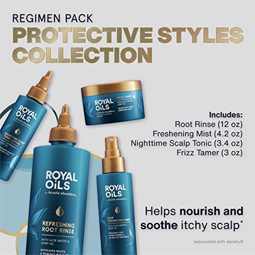 Extend the life of your protective style for an extra week, and sooth an itchy scalp with Head & Shoulders Royal Oils Protective Styles Collection Regimen Pack. This collection of scalp treatment products includes one bottle of Root Rinse (12 oz.), one bottle of Hair Freshening Mist (4.2 oz.), one bottle of Nighttime Scalp Tonic (3.4 oz.) and one container of Frizz Tamer (3 oz.). Use the dry scalp treatment products to lock in scalp moisture and gently wash away build up, refreshing the root for a healthier scalp in just three weeks. The result is healthy hair that is soothed, smooth and smelling clean. The expertly designed dry hair treatment products are for natural, curly and coily crowns as well as protective styles, braids, locs, wigs, and weaves. Infused with aloe water and hemp oil, the products provide 48 hours of freshness and light conditioning. Anoint your crown with nothing but the best scalp care. Developed for Black hair by Black scientists, the entire Head and Shoulders Royal Oils line helps balance natural moisture levels for healthy hair and scalp.