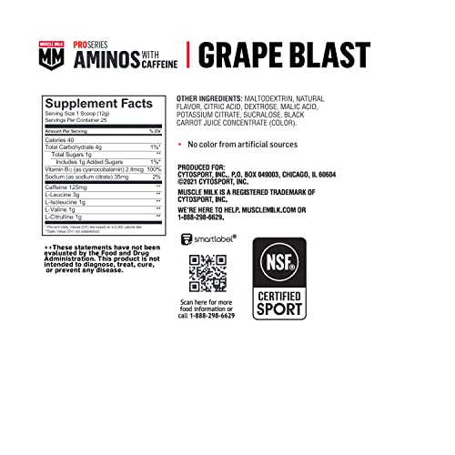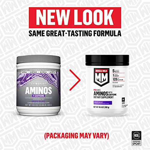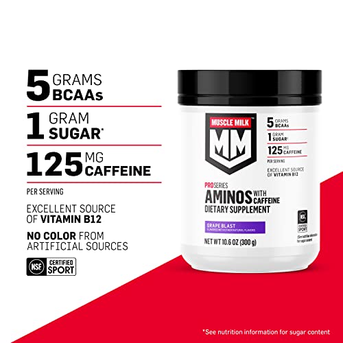 Muscle Milk Pro Series Aminos with Caffeine Powder Supplement, Grape Blast, 10.6 Ounces, 25 Servings, 5g BCAAs, 125mg Caffeine, 1g Sugar, Vitamin B12, NSF Certified for Sport, Packaging May Vary