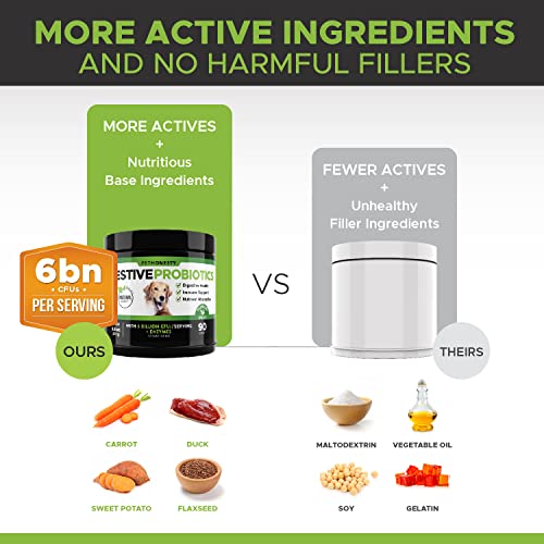 More Probiotics Per Serving (6 Billion CFUs) – Our Probiotics soft chews for dogs help support proper digestion and bowel health with a delicious combination of pumpkin, probiotics and digestive enzymes. Two of our 3 gram Probiotic chews have 6 billion CFUs which is more than most other brands. This means better results and a supply of probiotics that will last you longer than other brands!
