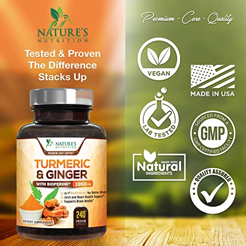 Turmeric Curcumin with Bioperine & Ginger: Our premium T3 Turmeric Curcumin Complex 1950mg, with standardized 95% Curcuminoids and 15mg Bioperine (Black Pepper) for best absorption
